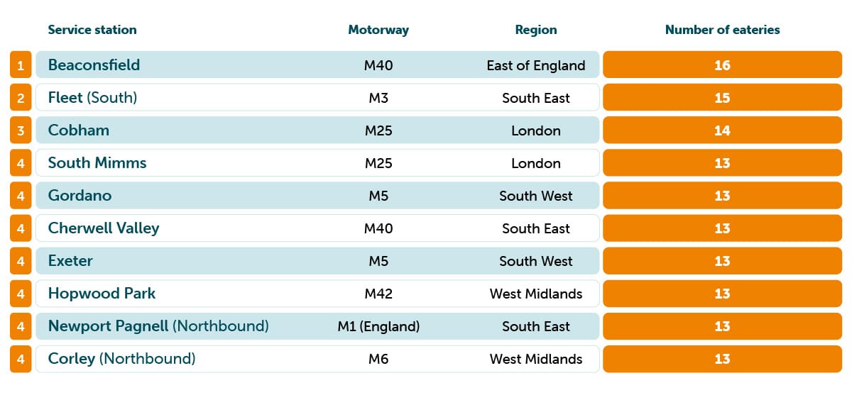Fleet (Southbound) and Cobham take second and third place, with 15 and 14 eateries, respectively.