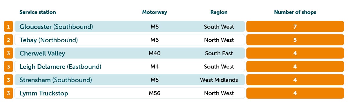 We used Motorway Services to find every service station in the UK, and the number of eateries and shops in each service station.