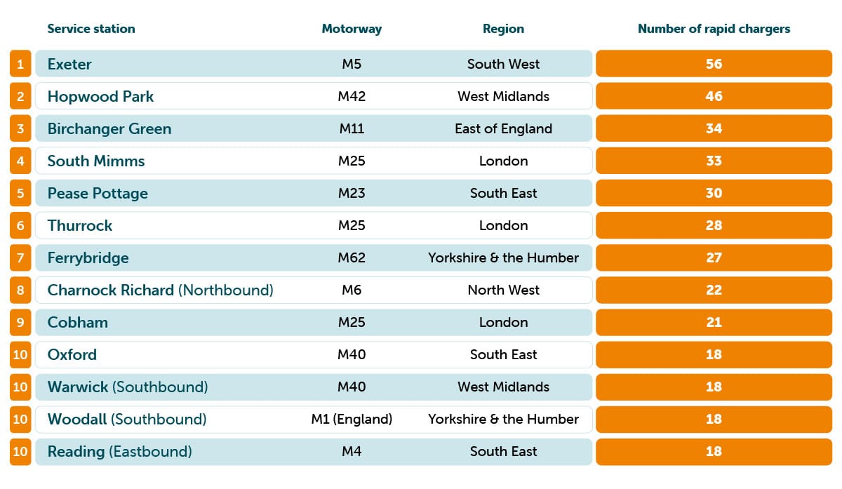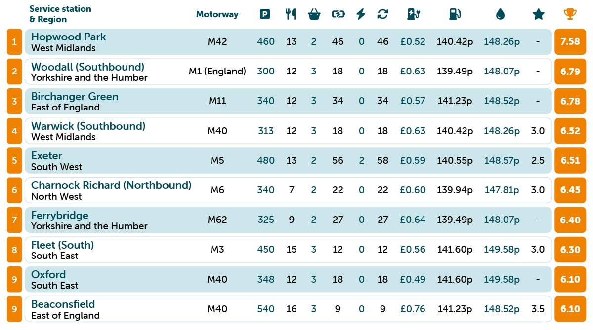 Hopwood Park, just south of Birmingham on the M42, takes the top spot, with a service station score of 7.58 out of 10. Hopwood Park has 460 parking spaces and 46 electric vehicle chargers, all of which are rapid chargers with a capacity of at least 25kW.
