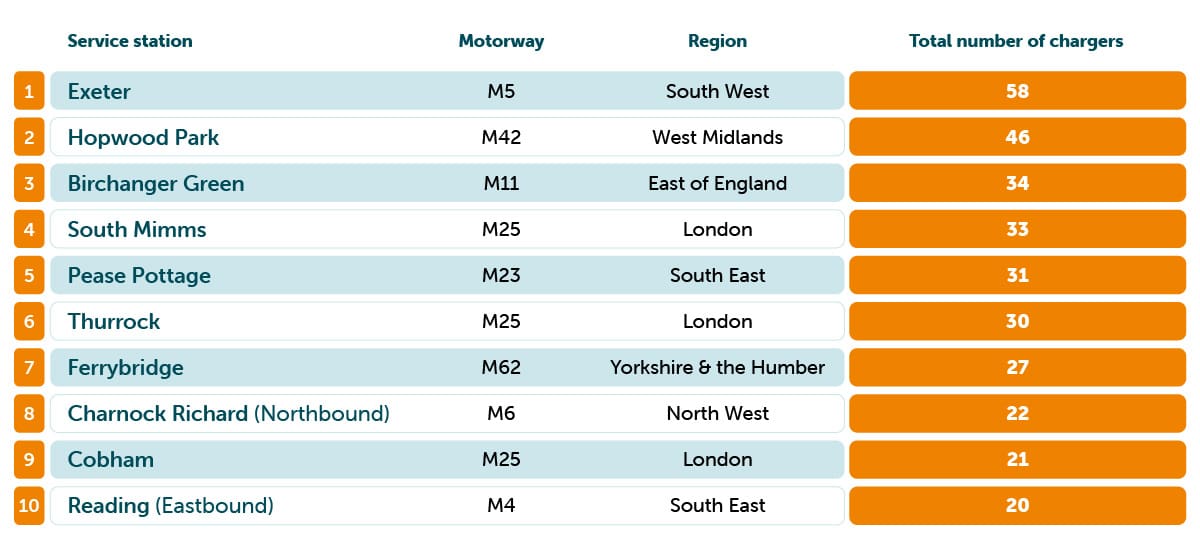 Exeter service station takes the top spot, with 58 charging devices in total. In addition to the 56 rapid charging devices, the charging station powered by GRIDSERVE Electric Highway also has 2 fast chargers, each with a maximum power capacity of 11kW. These are cheaper than the rapid charging stations, costing 49p/kWh, compared to the 79p/kWh rapid charging device costs.