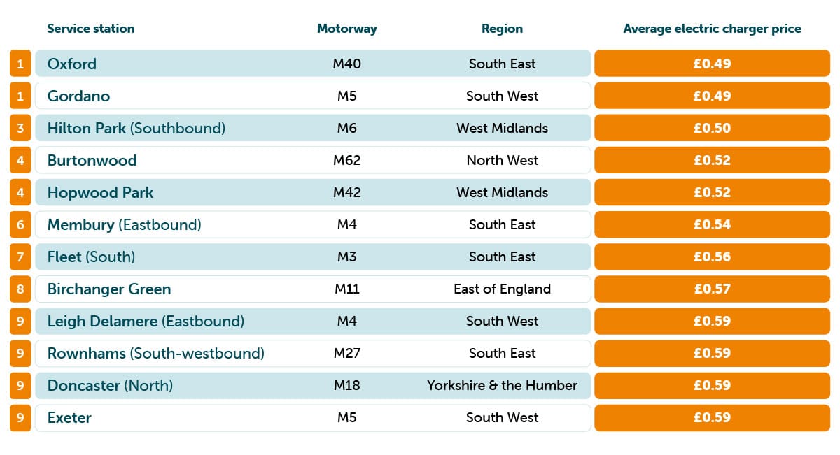 Service stations Oxford and Gordano share the top spot, with the average price of an EV charging device costing 49p/kWh. The price of charging your electric vehicle in both service stations ranges from 45p/kWh to 79p/kWh, with most charging points being Tesla-only.