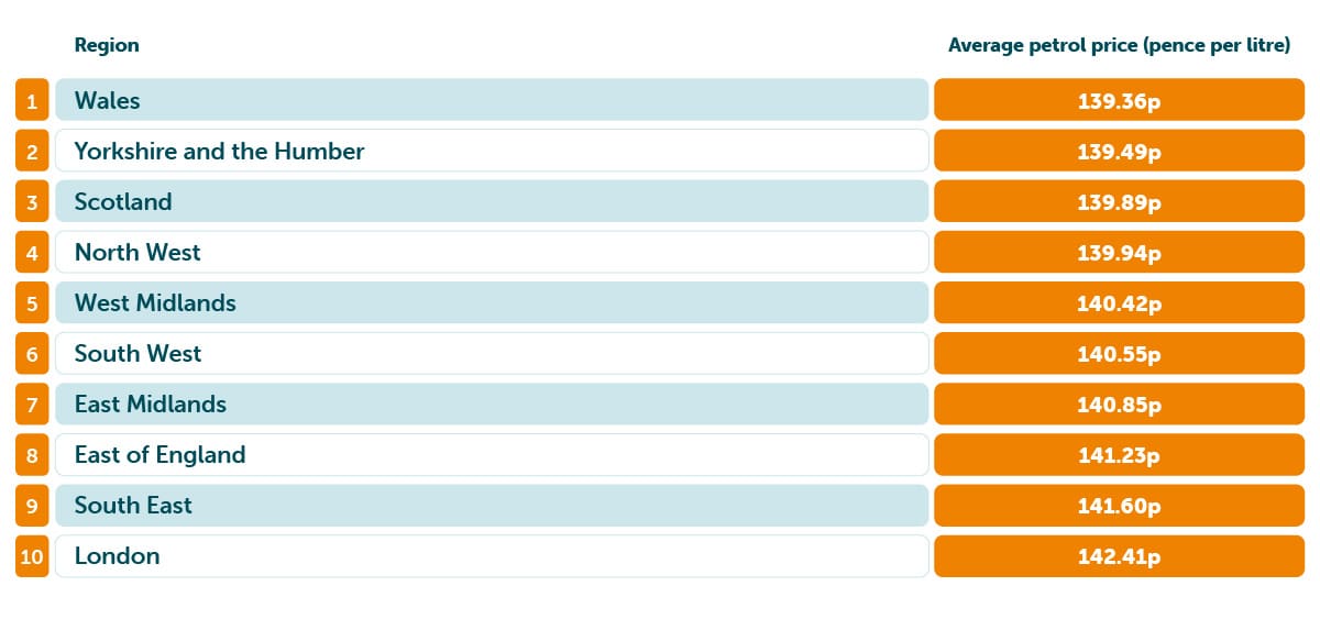 The region with the cheapest average petrol price is Wales, which costs 139.36p per litre on average. This is from Magor services, located at junction 23A M4, Wales’s largest and busiest service station.