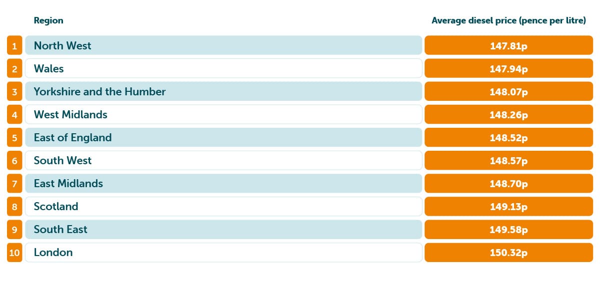 The North West has the cheapest diesel, costing 147.81p per litre on average. The 8 service stations with the lowest average diesel price are Burtonwood, Charnock Richard, Tebay, Birch, Southwaite, Chester, Lymm Truckstop, and Killington Lake, and you can find them on the M6, M62, and M56.