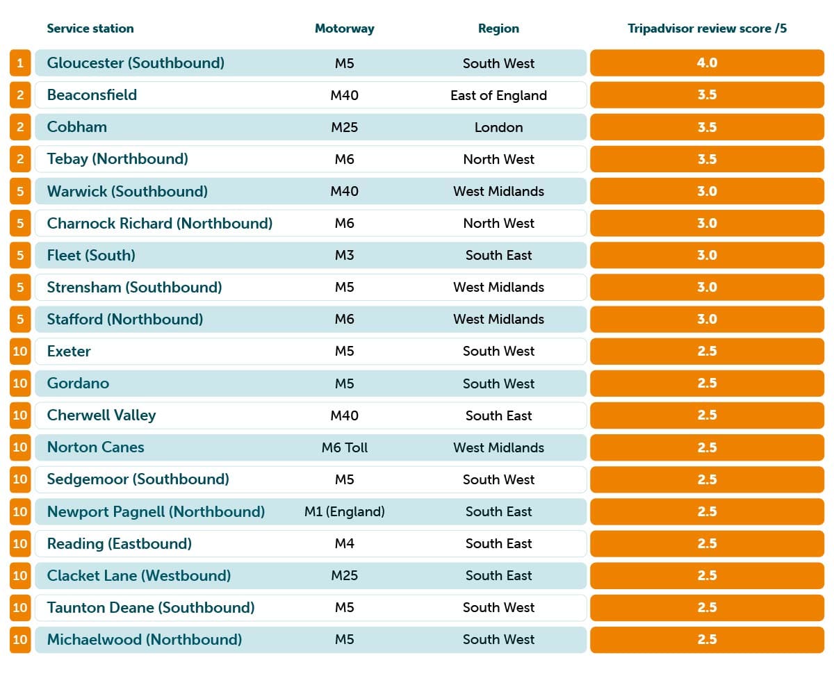 We looked into service stations’ Tripadvisor pages with a minimum of 100 reviews and found that Gloucester’s southbound service station is the best-rated service station, scoring 4/5 on Tripadvisor. More than 3,500 people have reviewed Gloucester Services, with reviewers praising its cleanliness, quality of food, and customer service.