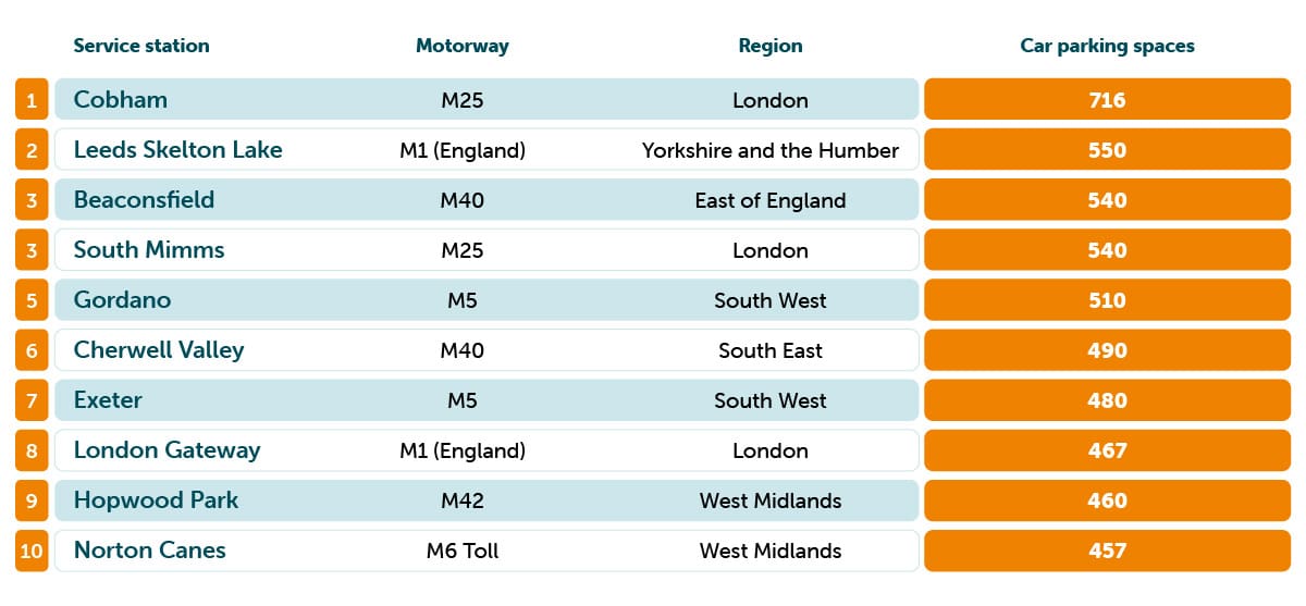 Leeds Skelton Lake had 550, the second-highest parking spaces in the UK, followed by Beaconsfield and South Mimms, who shared the third spot with 540 parking spaces.